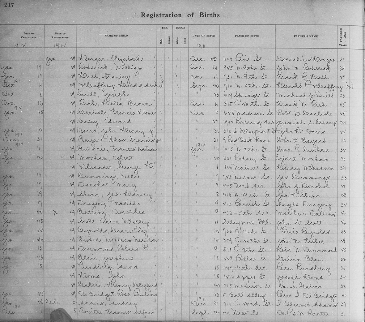 Note 1: Audrey Adams' birth is recorded on page 217 of the 1911 Registration of Births for the city of Wilmington, DE.
