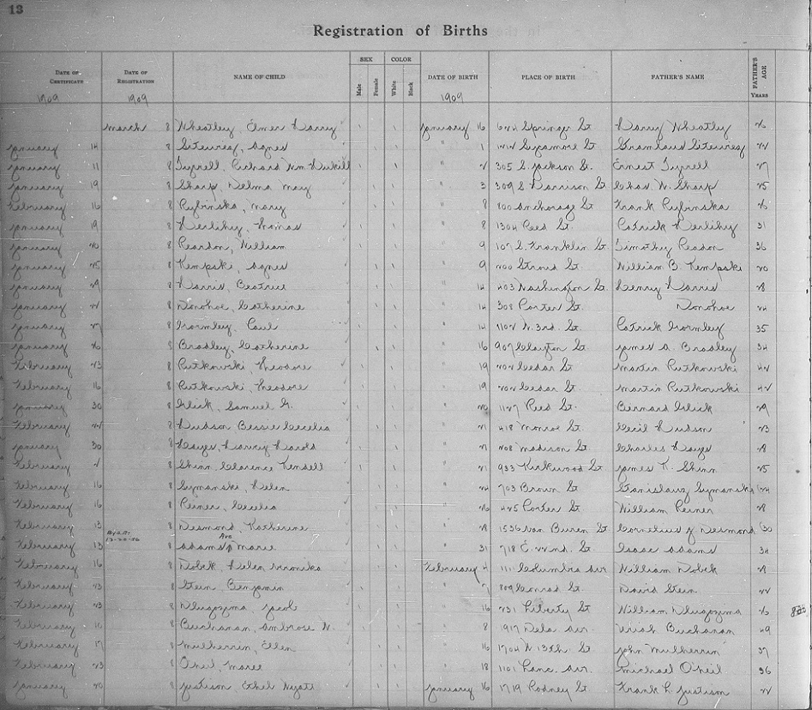 Note 1: Ave Marie Adams' birth is recorded on page 13 of the 1909 Registration of Births for the city of Wilmington, DE.