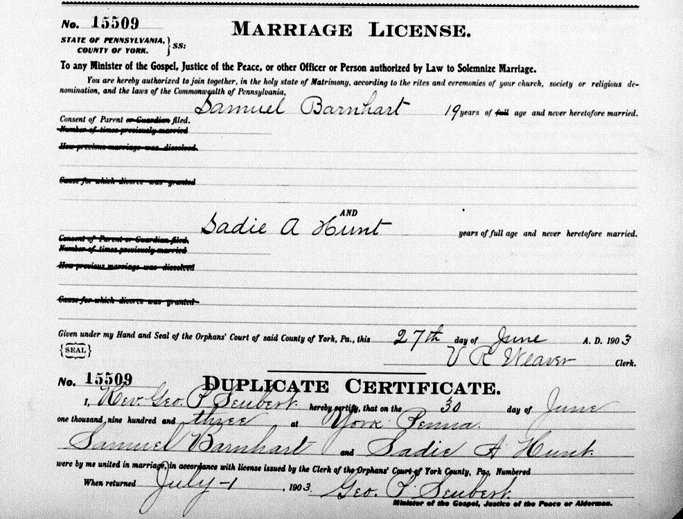 Roman Paul Barnhart / Sarah Agnes Hunt Married June 30, 1903 York, PA