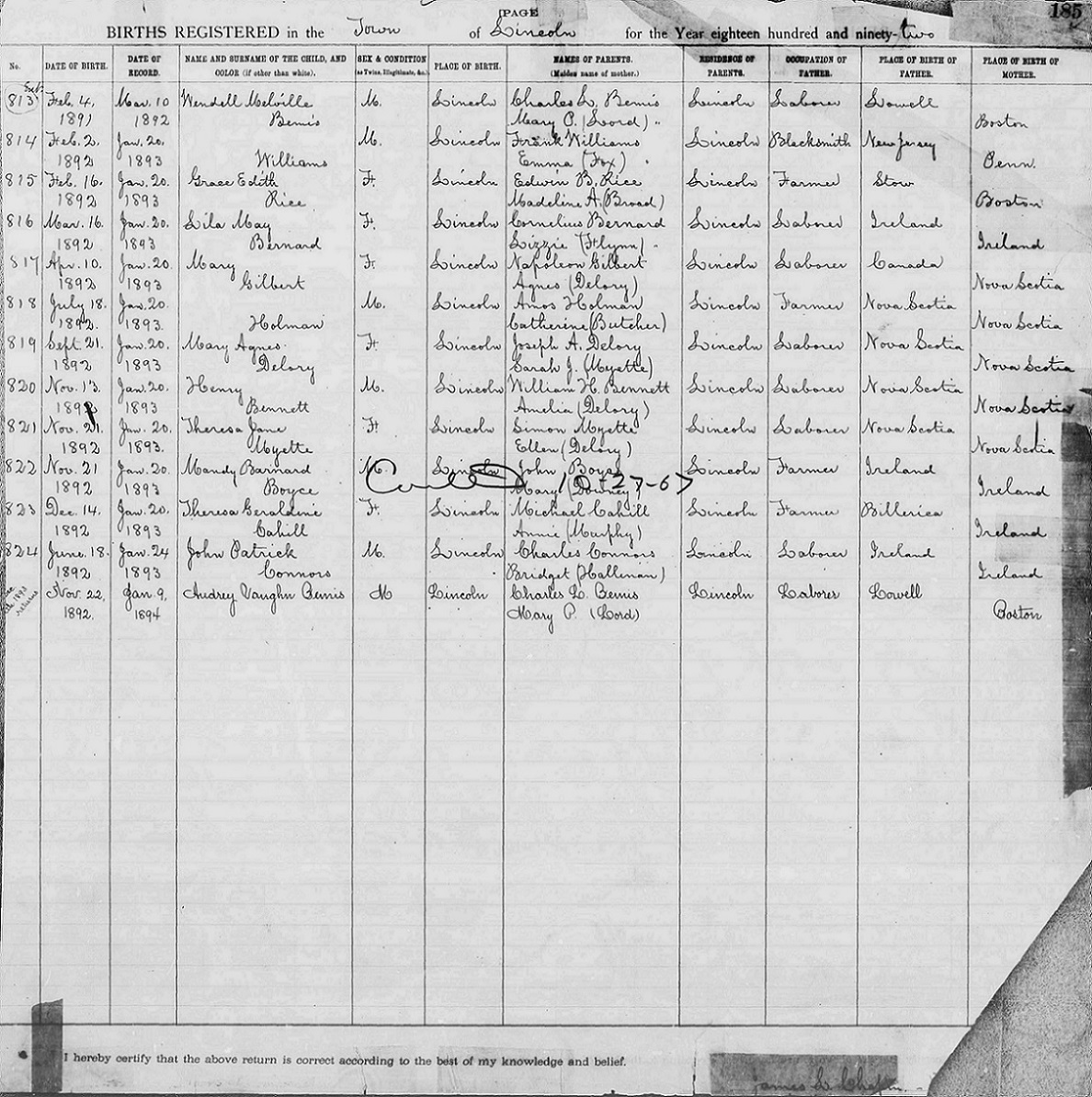 Note 1: The Manley Bernard Boyce entry is entry #822, the 4th entry up from the bottom of the page.