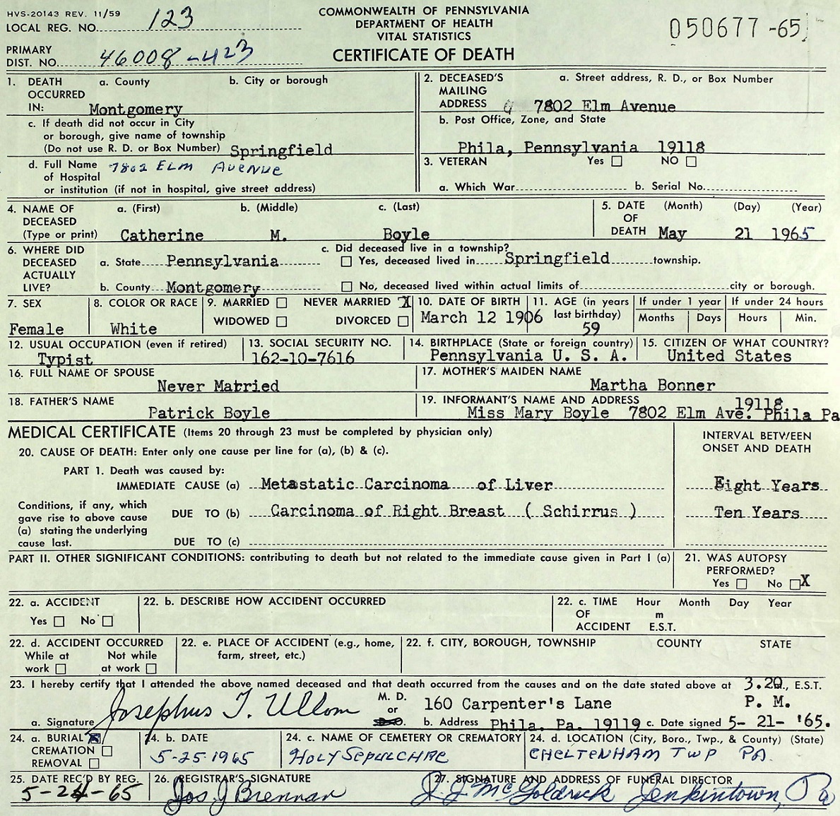 Catherine M. Boyle Died May 21, 1965 Springfield Township, PA, USA