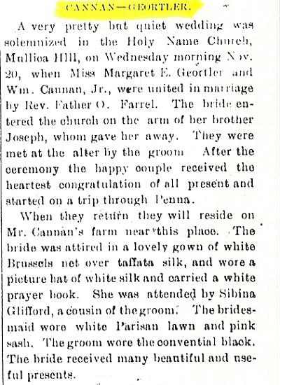 Note, the article mentions "a cousin of the groom", and called her Sibina Glifford. Well, the girl's first name was actually Sabina, not Sibina. Also, her last name was Clifford, not Glifford. After all, William Cannan's mother's maiden name was Catherine Swift. Sabina Clifford's mother's maiden name was Maggie Swift. For more information on Sabina Clifford's family, click here.