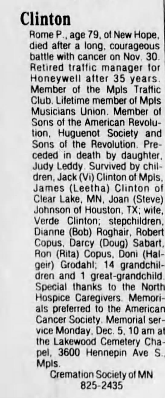 Rome Paul Clinton, wife of Margaret Joan (nee Stark) Clinton, died November 30, 1994, in the city of New Hope, in Hennepin County, Minnesota, USA. I have obtained a copy of Rome Paul Clinton's obituary. To view a copy of the Rome Paul Clinton obituary I have obtained, click here. Rome Paul Clinton was buried in Lakewood Cemetery, in Minneapolis, Minnesota, USA. A Find A Grave memorial has been created for Rome Paul Clinton. To view the Rome Paul Clinton Find A Grave memorial, click here.