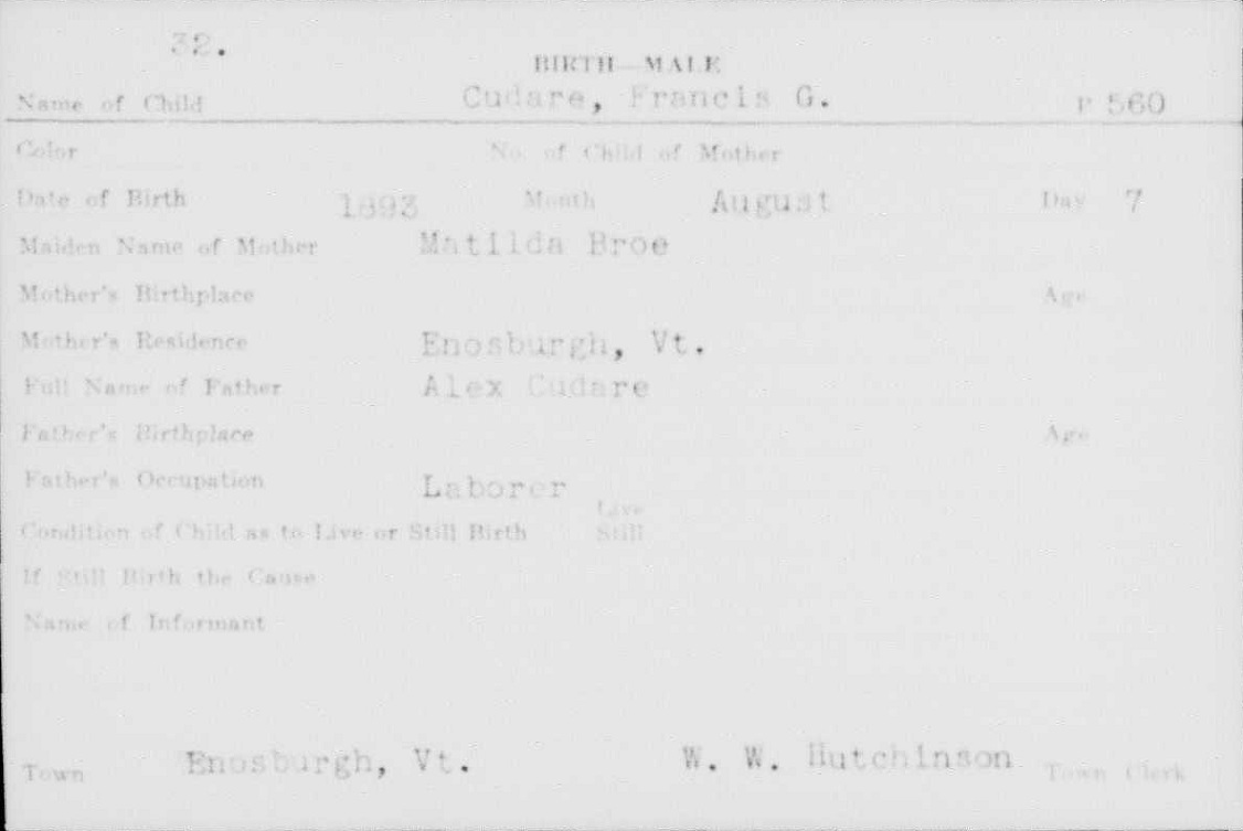 Francis George Codair/Coderre Born August 7, 1893 Enosburgh, VT, USA
