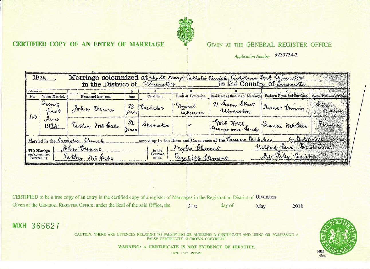 Note 1: John Dunne / Esther McCabe married in St. Mary's Catholic Church.