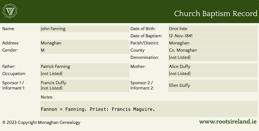 John Fanning Baptized Novenber 12, 1841 Monaghan Parish Co. Monaghan, Ireland