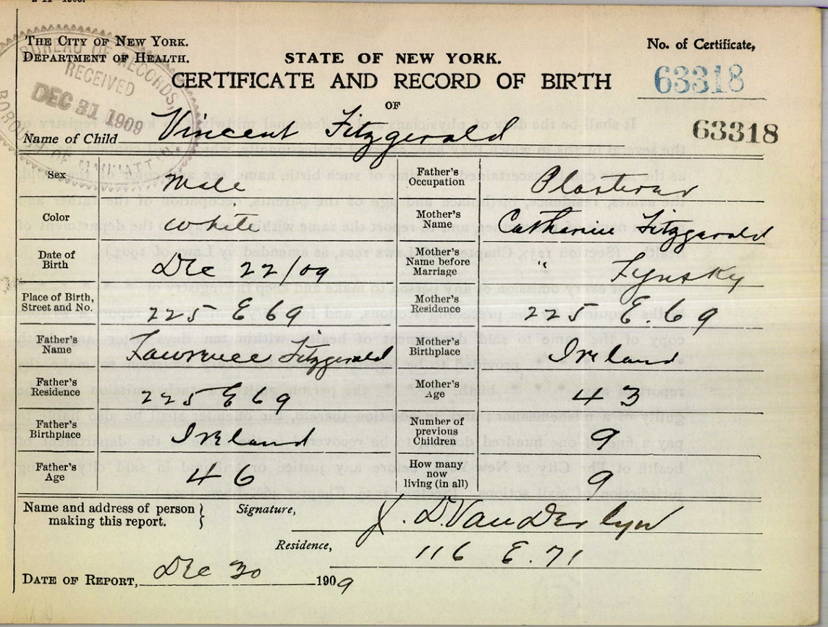 Vincent Fitzgerald Born December 22, 1906 Manhatten, NY, USA