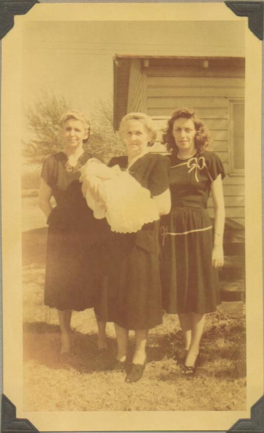 Picture taken at Delaware Ordinance Depot, Pedricktown, New Jersey, on May 9, 1948. The woman in the center is Mary (nee Geortler) Jecker. The woman to Mary's right is Mary's daughter, my grandmother, Agnes (nee Jecker) Kernan. The woman to Mary's left is Mary's granddaughter, my mother, Teresa (nee Kernan) McCabe. The baby is Teresa's first son, James P. McCabe, Jr., who was born April 16, 1948.