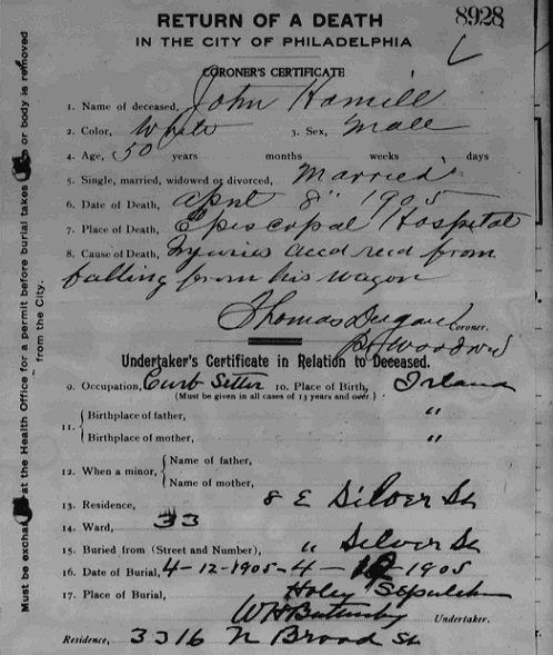 John Hamill Died: April 8, 1905 Philadelphia, PA