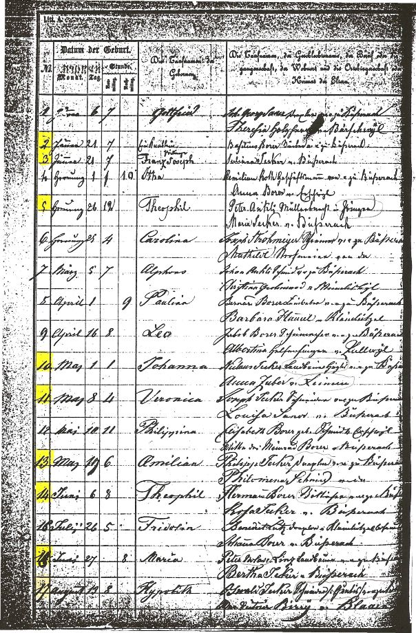 Note 2: Column headings are sequential number, birth date & time (am or pm), child's name, and parental information.