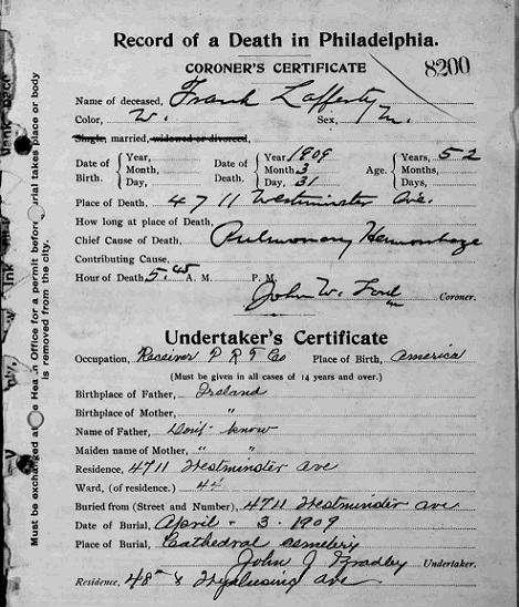 Frank Lafferty Died March 31, 1909 Philadelphia, PA, USA