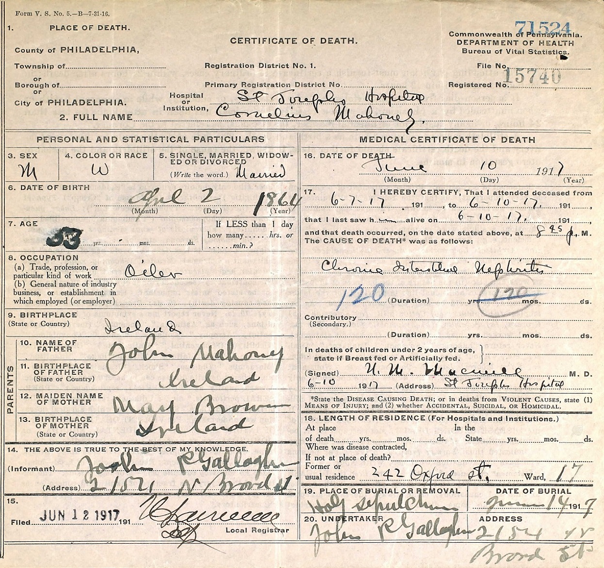 Cornelius Mahoney Died June 10, 1917 Philadelphia, PA