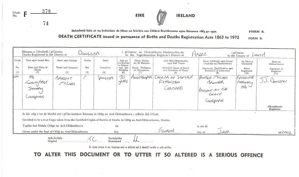 Bridget McCabe Died January 21, 1916 Cookspark, Co. Louth, Ireland