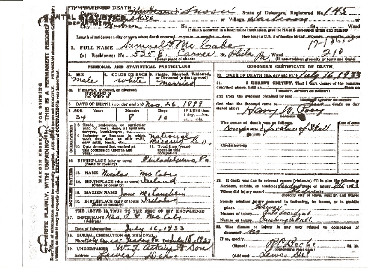 Note: The death certificate says Samuel was buried in Holy Cross Cemetery, in Yeadon, PA. However, the Nicholas F. McCabe cemetery lot profile, for the lot Nicholas McCabe bought in Holy Sepulchre Cemetery, says Samuel was buried in Holy Sepulchre cemetery. That is a conflict I will need to resolve.