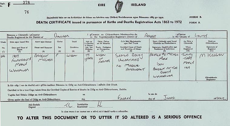 I believe this is the death record for my great great grandmother Bridget (nee Murphy) McCabe.