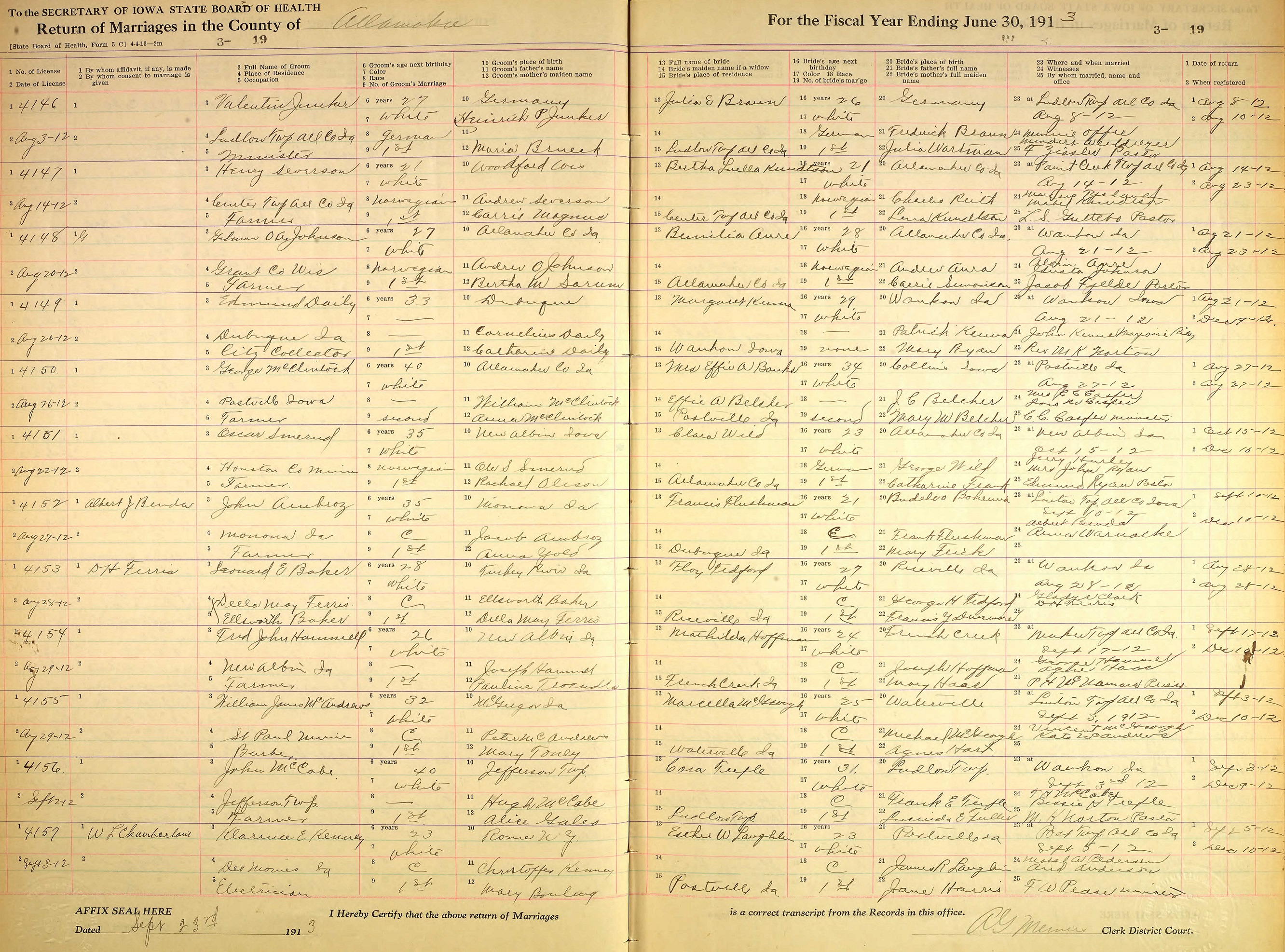 Note 1: The John E. McCabe / Cora Mabel Teeple entry is license number 4156, the next to last entry on the page.