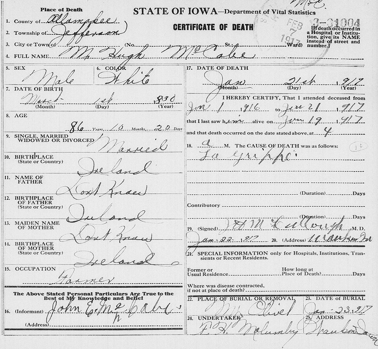 Hugh McCabe Died January 21, 1917 Jefferson Township, Iowa, USA