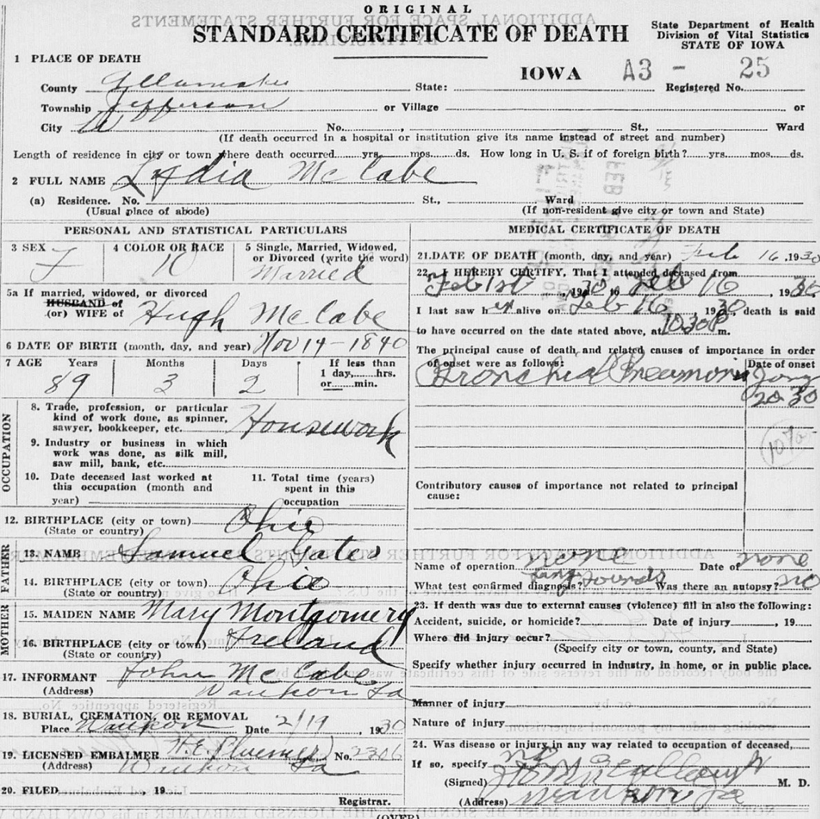 Lydia A. McCabe Died February 16, 1930 Jefferson Township, Iowa, USA