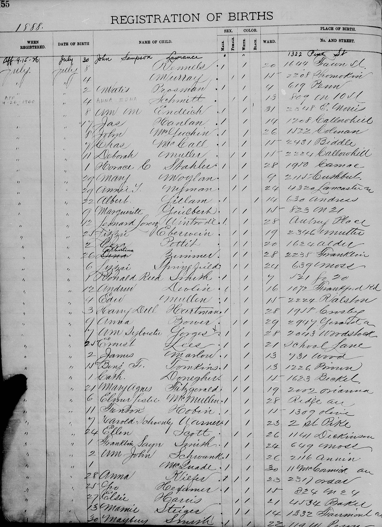 Note 1: John McQuaid/McQuade's birth is recorded on page 55 of the 1888 Birth Register for the city of Philadelphia, PA.