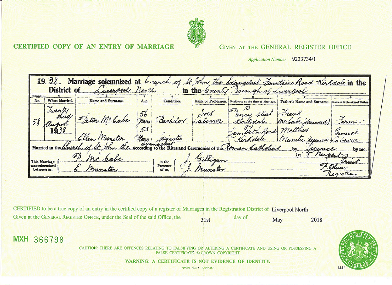 Note 1: Peter McCabe / Ellen Munster married in St. John the Evangelist Catholic Church.