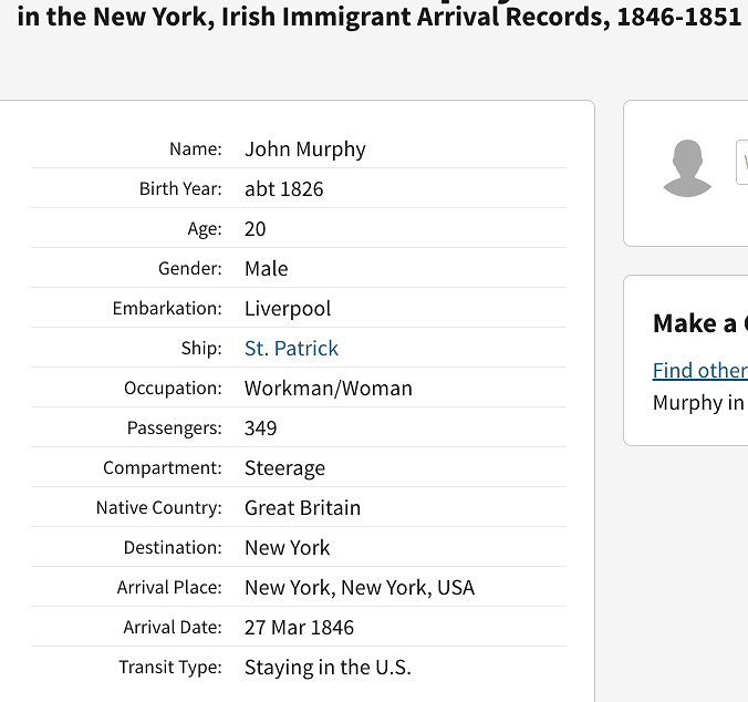 John Murphy Arrived New York, New York, USA March 27, 1846