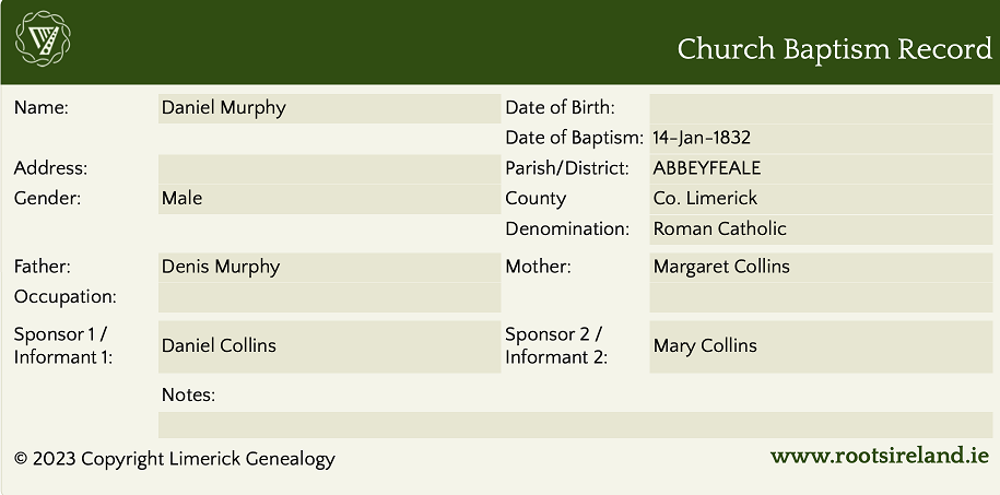 Daniel Murphy Son of Dennis Murphy and Margaret (nee Collins) Murphy Baptized January 14, 1832