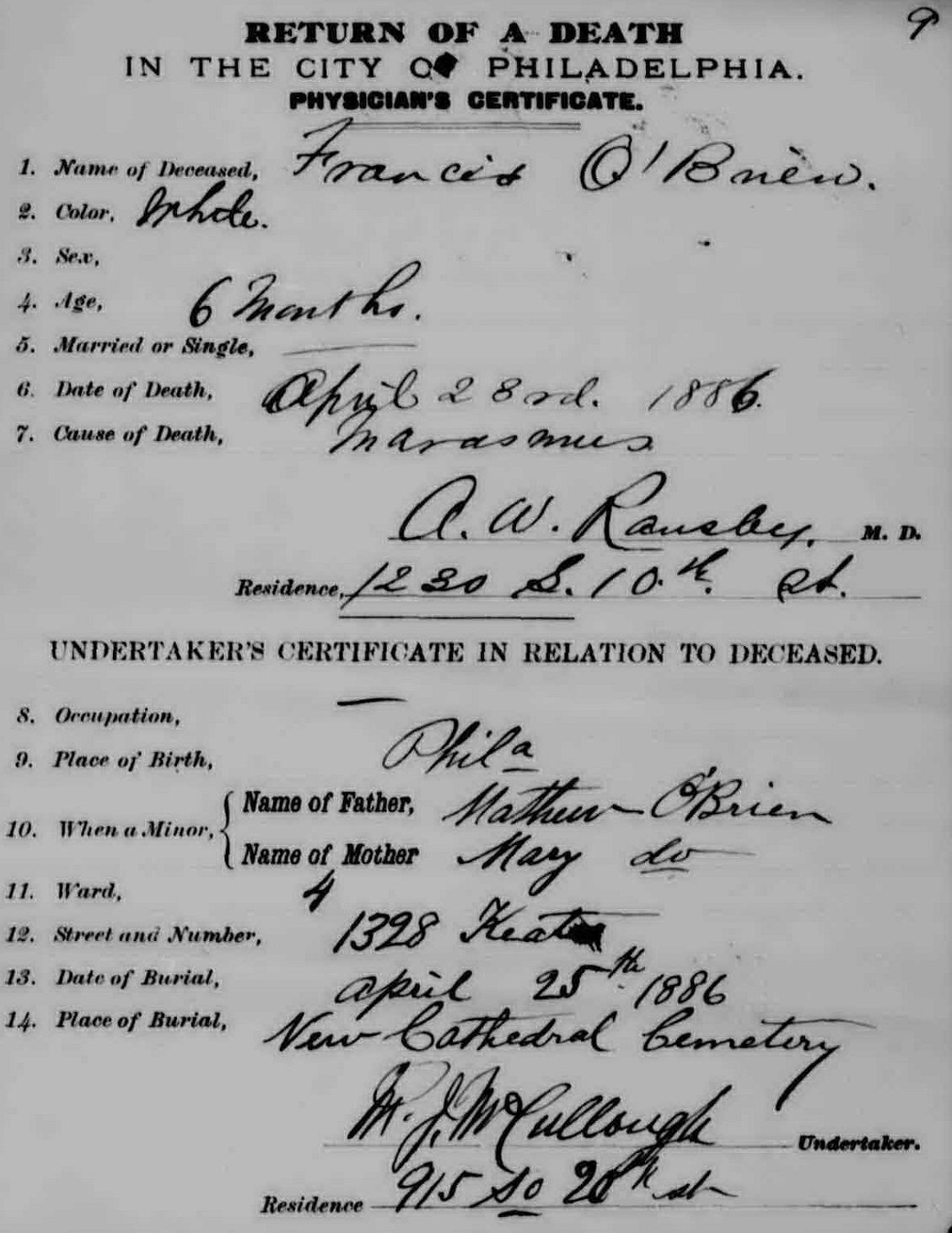 Francis O'Brien Died April 28, 1885 Philadelphia, PA