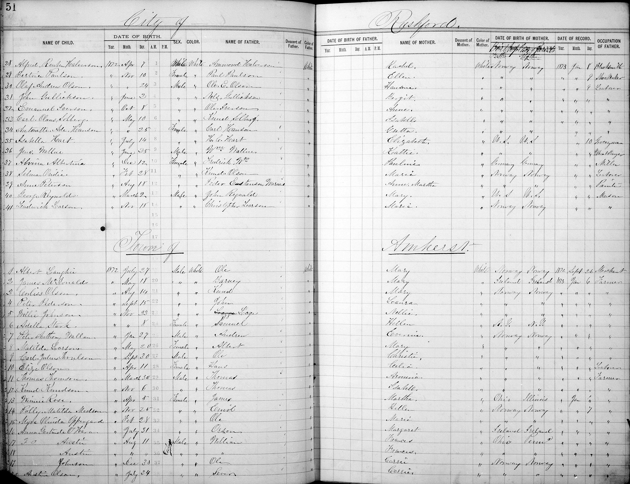 Anna Gertrude O'Hara/O'Hare, daughter of Owen and Margaret (nee Nugent) O'Hara/O'Hare, was born July 31, 1872, in Amherst, MN. I have obtained a copy of Anna Gertrude O'Hara/O'Hare's birth register. The Anna Gertrude O'Hara/O'Hare birth register entry I have obtained is currently recorded on LDS "film number" 1316799, image #80. Anna Gertrude O'Hara/O'Hare's birth is listed on line #16, the 5th line up from the bottom of the page. To view a copy of the Anna Gertrude O'Hara/O'Hare birth register entry I have obtained, click here. This is undoubtedly Anna Gertrude O'Hara/O'Hare's birth register even though her father's name is not listed correctly.