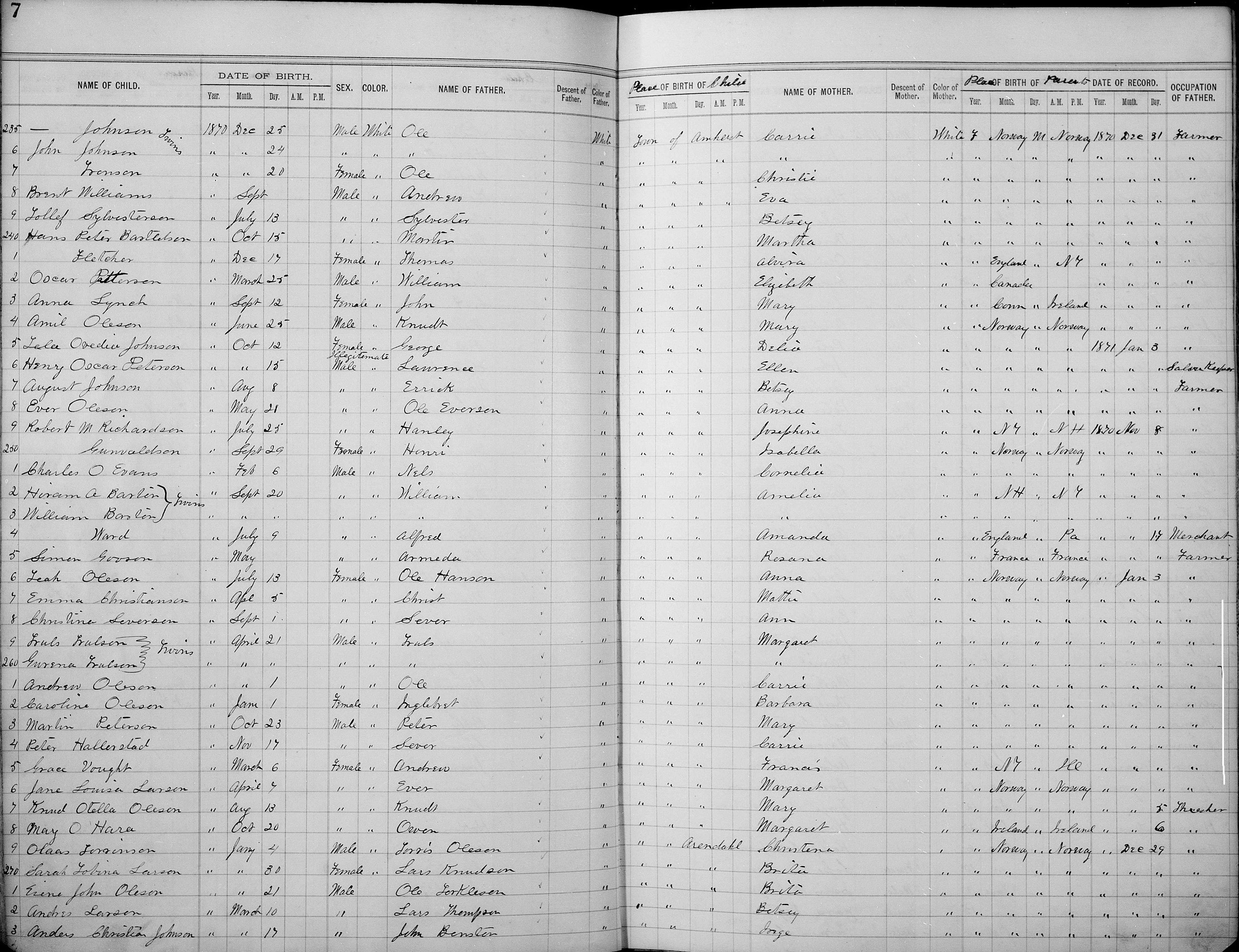 Mary O'Hara/O'Hare, daughter of Owen and Margaret (nee Nugent) O'Hara/O'Hare, was born October 20, 1870, in Amherst, MN. I have obtained a copy of Mary O'Hara/O'Hare's birth register. The Mary O'Hara/O'Hare birth register entry I have obtained is currently recorded on LDS "film number" 1316799, image #32. Mary O'Hara/O'Hare's birth is listed on line #268, the 6th line up from the bottom of the page. Mary's name is listed as May, nor Mary. To view a copy of the Mary O'Hara/O'Hare birth register entry I have obtained, click here.