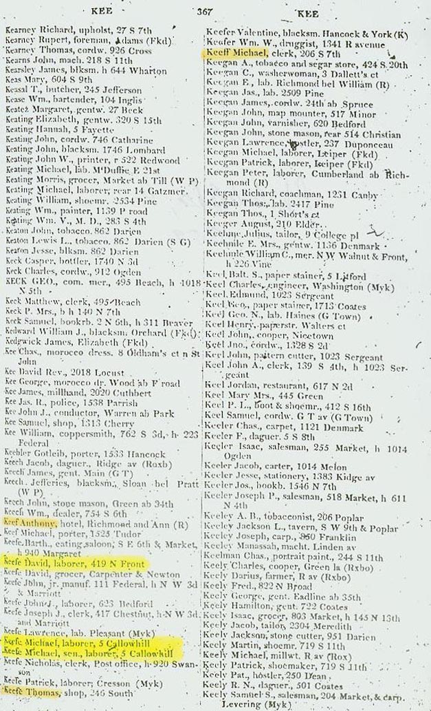 This 1859 Philadelphia, PA city directory shows the person I refer to as old David Keefe/O'Keefe living at 419 N. Front. Note there are two Michael Keefe/O'Keefes living at #5 Callowhill listed in 1859 according to this Philadelphia, PA city directory. I don't know what relationship, if any, existed between these two.