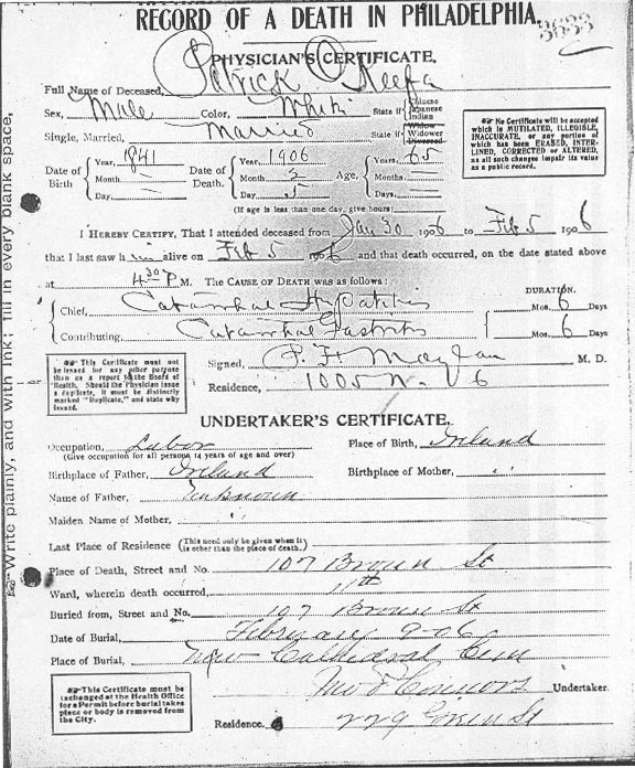 Patrick Keefe/O'Keefe Husband of Anna (nee Morrissey) Keefe/O'Keefe Died February 5, 1906 Philadelphia, PA