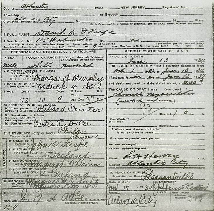 Larry's Great, Great Grandfather John O'Keefe's Families Page