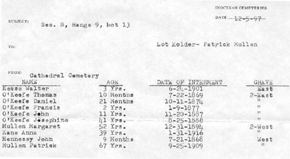 The information presented here was obtained from Cathedral Cemetery in Philadelphia, PA. The information provided by the cemetery shows the lot owner to be Patrick Mullen. I'm certain Patrick Mullen was Josephine (nee Curtain) Keefe/O'Keefe's brother in law. The death notice for Josephine (nee Curtain) Keefe/O'Keefe, copied from The Philadelphia Record, dated Saturday, August 25, 1888, states that Josephine was to be buried from the home of her sister at 619 Tamarind St. A copy of an 1887 Philadelphia, PA city directory shows a Patrick Mullen living at 619 Tamarind St. Copies of the 1870 and 1880 Philadelphia, PA Federal census shows a couple named Patrick and Margaret Mullen. They were living near Josephine Keefe/O'Keefe each of those census years. I intend, if possible, to obtain copies of the marriage records for Thomas O'Keefe and his wife Josephine and for Patrick Mullen and his wife Margaret. I expect those two records to confirm my suspicions that Josephine O'Keefe and Margaret Mullen were sisters. Or, they were at least two women whose maiden names were the same.