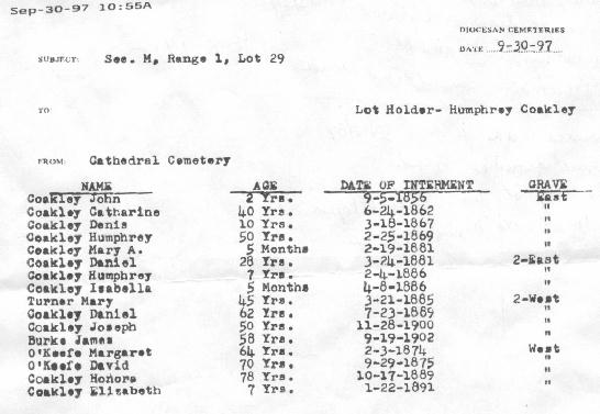 The information presented here was obtained from Cathedral Cemetery in Philadelphia, PA. The information provided by the cemetery shows the lot owner to be Humphrey Coakley. I do not know who Humphrey Coakly was. I don't know if any relationship, be it by marriage or by blood, existed between the Coakleys and old David and old Margaret.