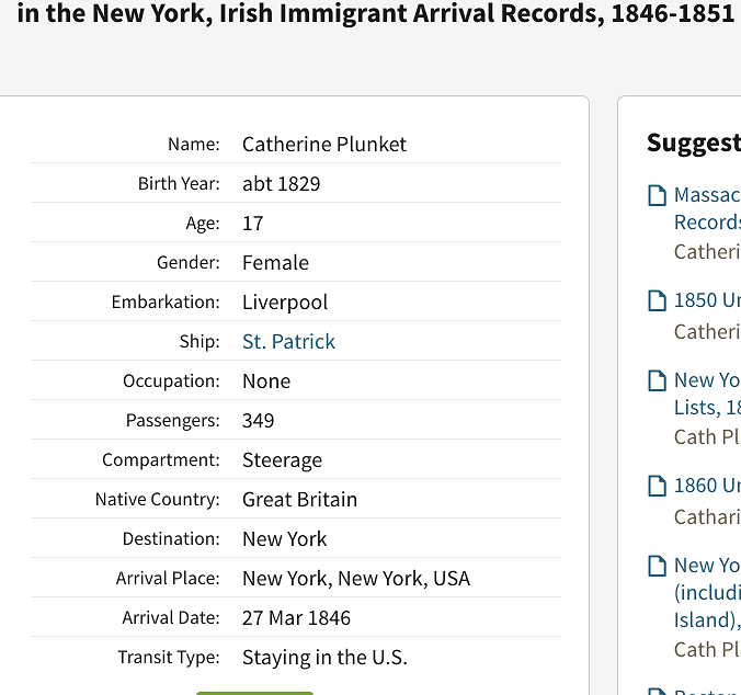 Catherine Plunkett Arrived New York, New York, USA March 27, 1846