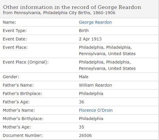 George Reardon Born April 2, 1913 Philadelphia, PA