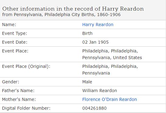 Harry Reardon Born January 2, 1905 Philadelphia, PA