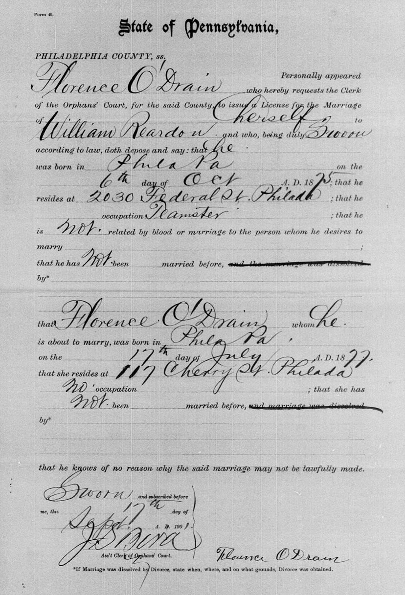 William Reardon / Florence O'Drain Marriage License Application September 17, 1901 Philadelphia, PA