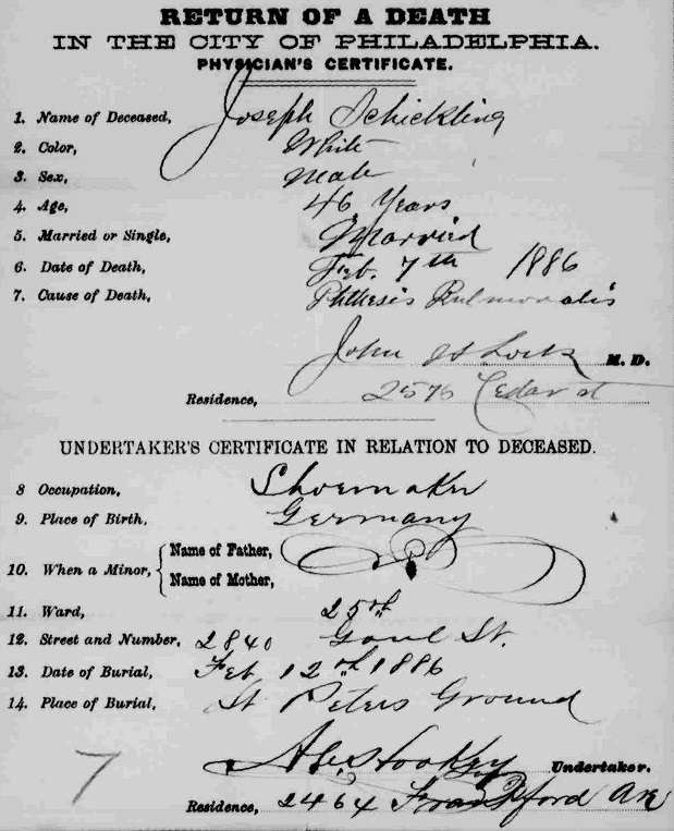 Joseph J. Schickling Died February 7, 1886 Philadelphia, PA, USA