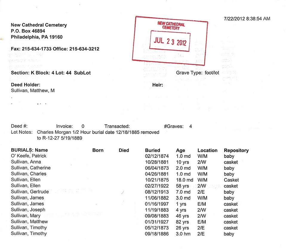 The information presented here was obtained from New Cathedral Cemetery in Philadelphia, PA. The information provided by the cemetery shows the lot owner to be Matthew M. Sullivan. Matthew Sullivan was a son in law of the couple I refer to as old David and old Margaret Keefe/O'Keefe, having married old David and old Margaret's daughter Mary. The death notice for old David Keefe/O'Keefe, copied from the Public Ledger, dated Wednesday, September 29, 1875, states that old David's funeral was to be held at the home of his son-in-law, Matthew Sullivan, at 236 Poplar St. The 236 Poplar Street address is a known address for Matthew and Mary (nee Keefe/O'Keefe) Sullivan.