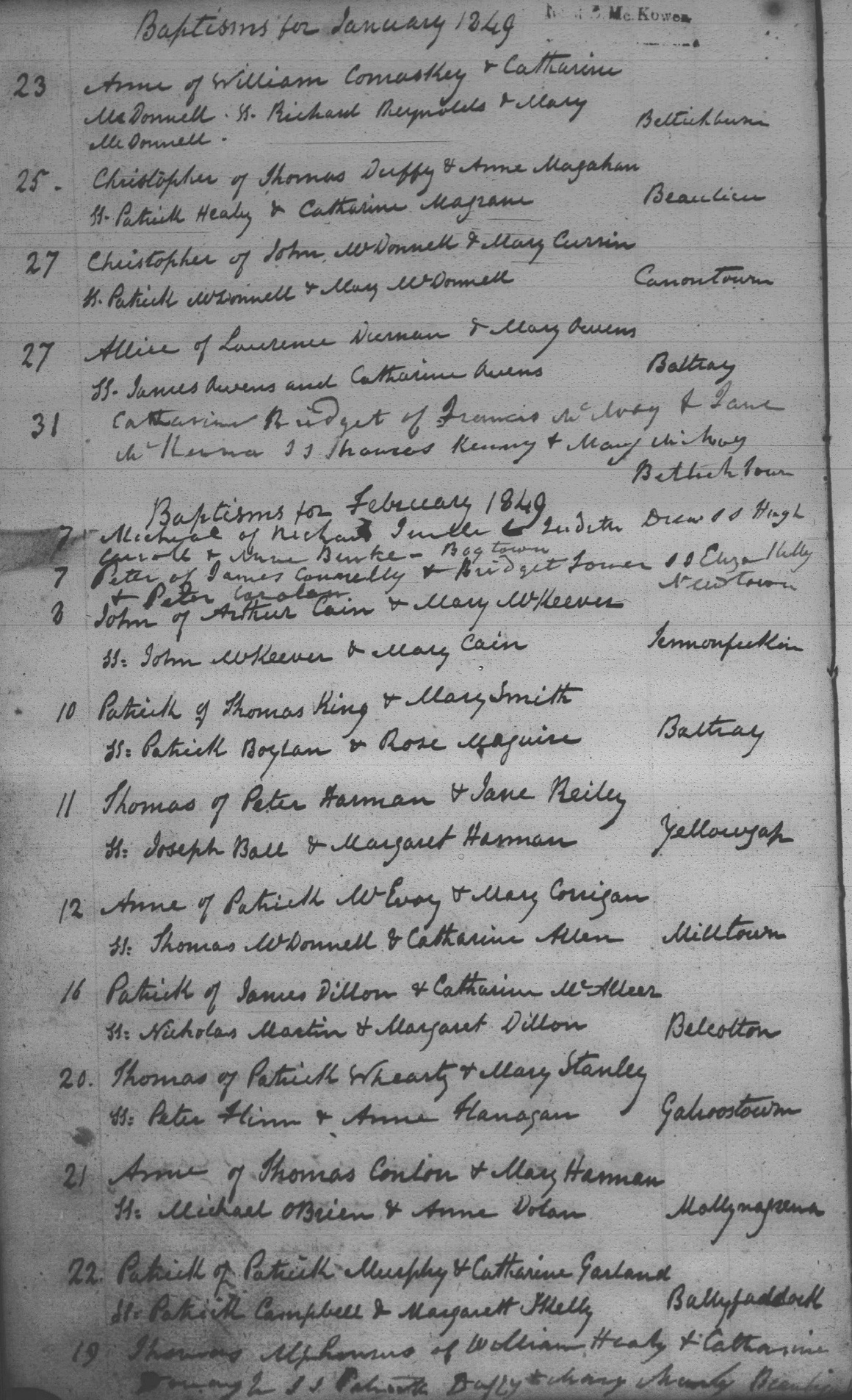 Note 2: Michael Turtle is the first entry after the Baptisms for February 1849 heading.