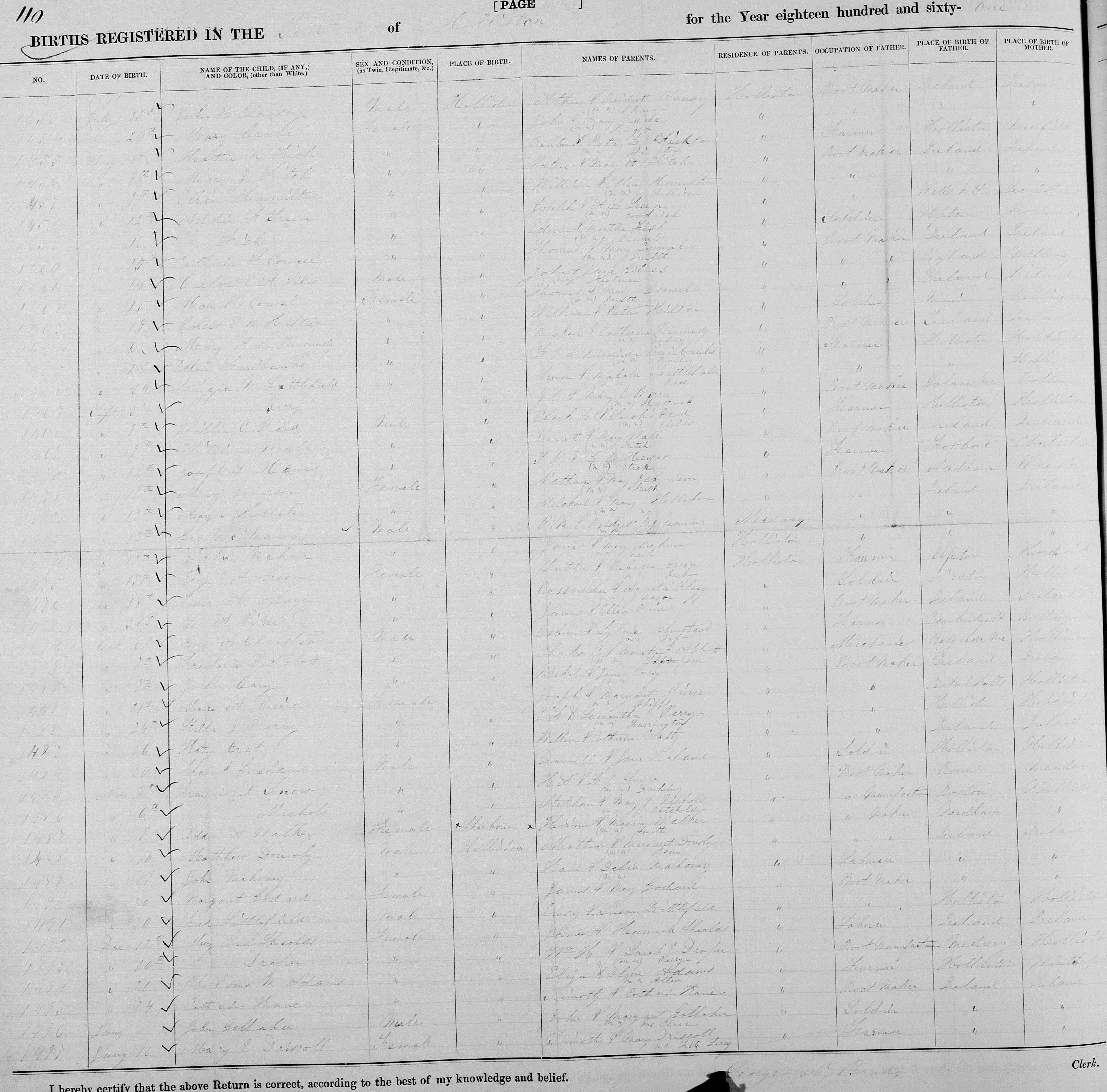 Caution: This page is mostly unreadable. But, if you scroll down to where you see a fairly dark line drawn on the page, if you scroll to the right to the parents names column, then count up about 9 or 10 lines, you should be able to make out the names Garrett and Mary Wall. Seeing the Garrett and Mary Wall names at least confirms that Garrett and Mary did have a child born during the year 1861. Other records indicate that child's name was William F. Wall.