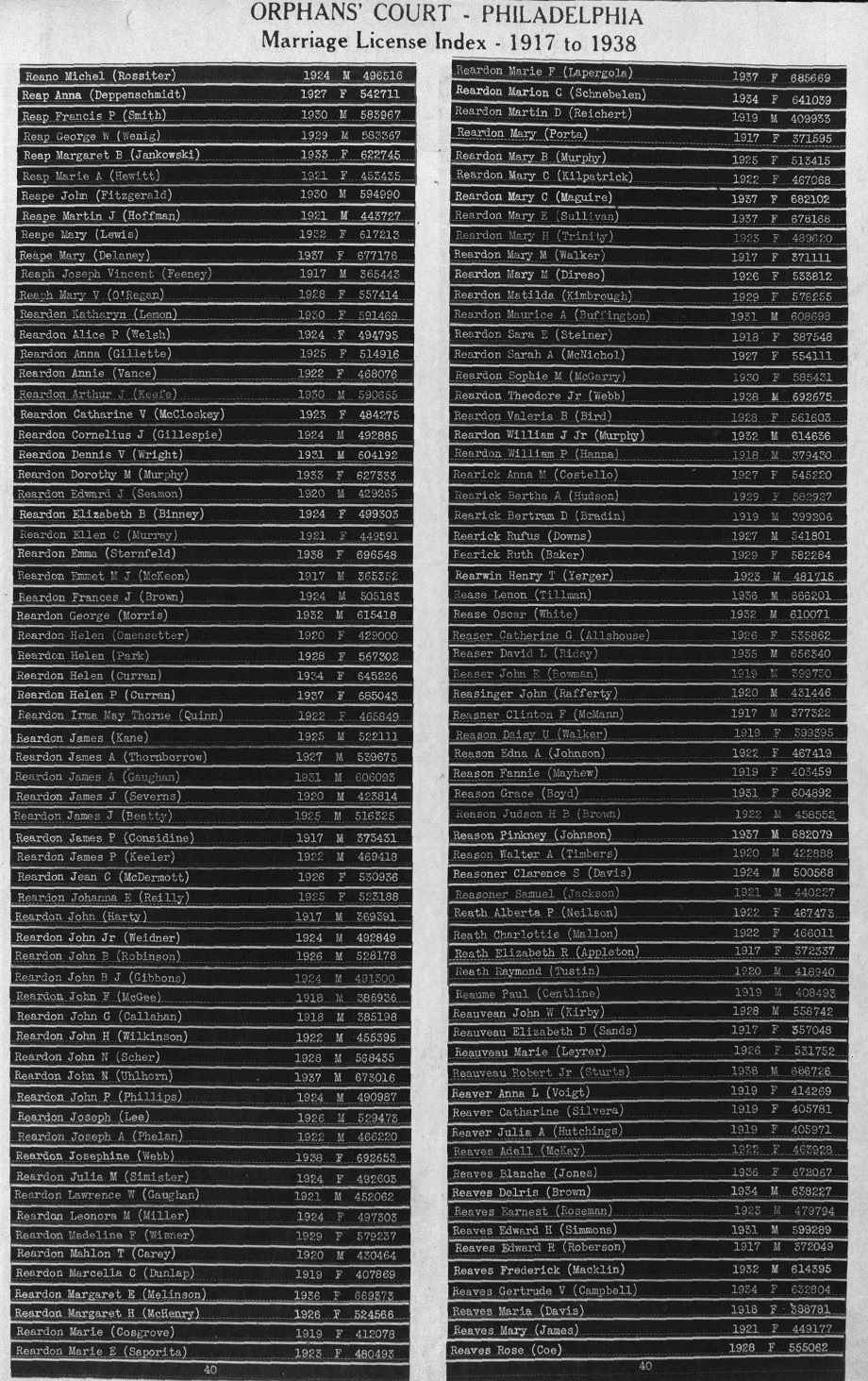Madeline F. Reardon Marriage License Index Philadelphia, PA - 1929 License # 579237