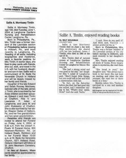Larry's James Joseph and Sara "Sallie" Agnes (nee Morrissey) Timlin Family Page